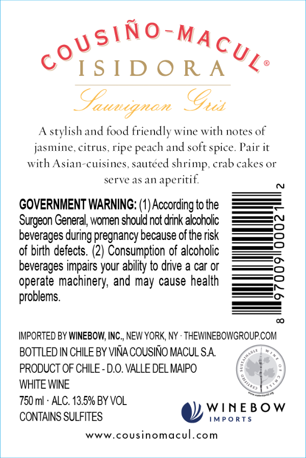 Cousiño Macul Isidora Sauvignon Gris Back Label